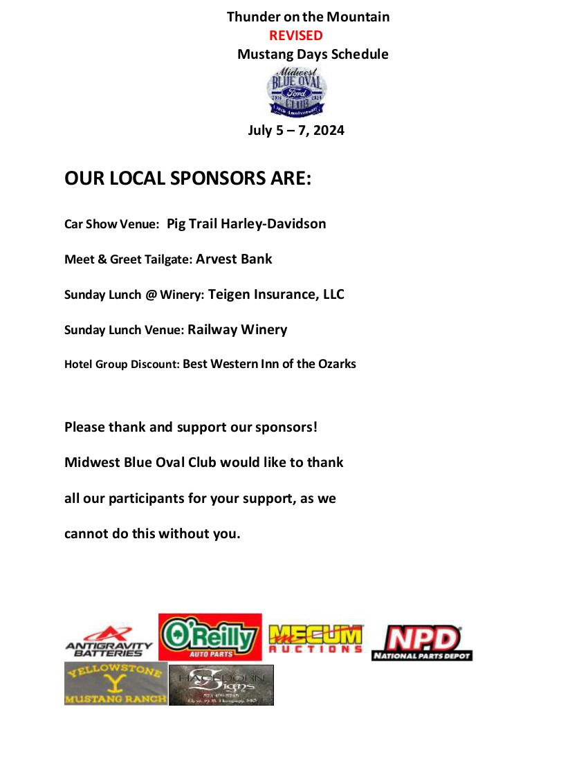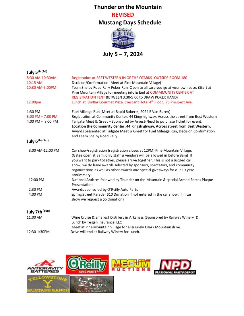 Mark your calendars for the Largest & Longest Running All Ford & Mustang event in the State of Arkansas located in Eureka Springs, Arkansas, the 2024 Eureka Springs Thunder on the Mountain May 30th- June 2nd 2024. This event will showcase Mustangs of every model, every year, customized, stock and whatever else you can do to a Mustang to make it unique. Even though we advertise this as a Mustang event, we are also including any Ford, Lincoln, Mercury, Saleen, Roush, or Shelby product who wishes to participate.