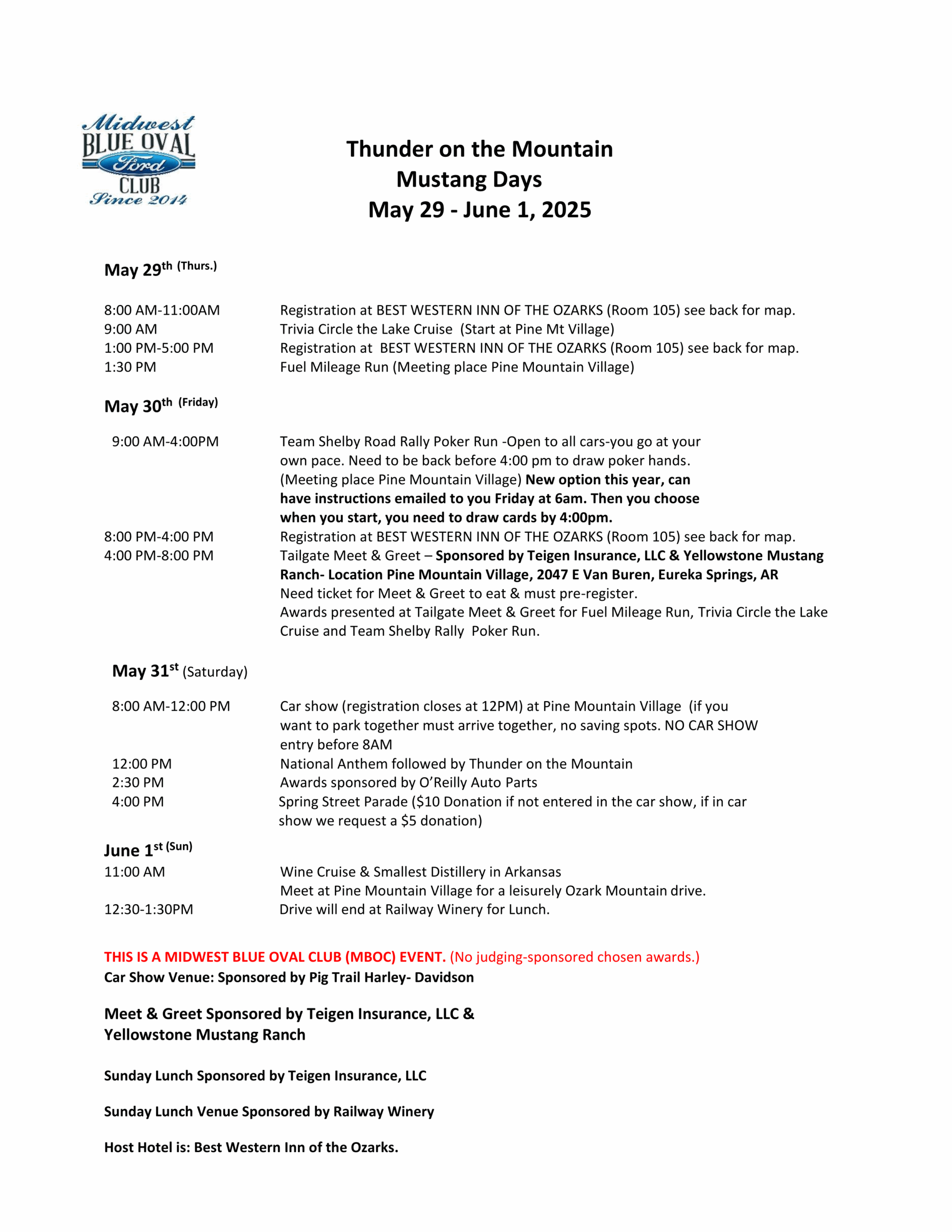 Mark your calendars for the Largest All Ford & Mustang event in the State of Arkansas located in Eureka Springs, Arkansas, the 2025 Eureka Springs Thunder on the Mountain May 29th – June 1st. This event is open to ALL FORD POWERED or FORD BODIED PRODUCTS. This is not an MCA judged event but is a Midwest Blue Oval Club event. There will be many plaques and trophies awarded for driving events and sponsor picked awards at the car show.